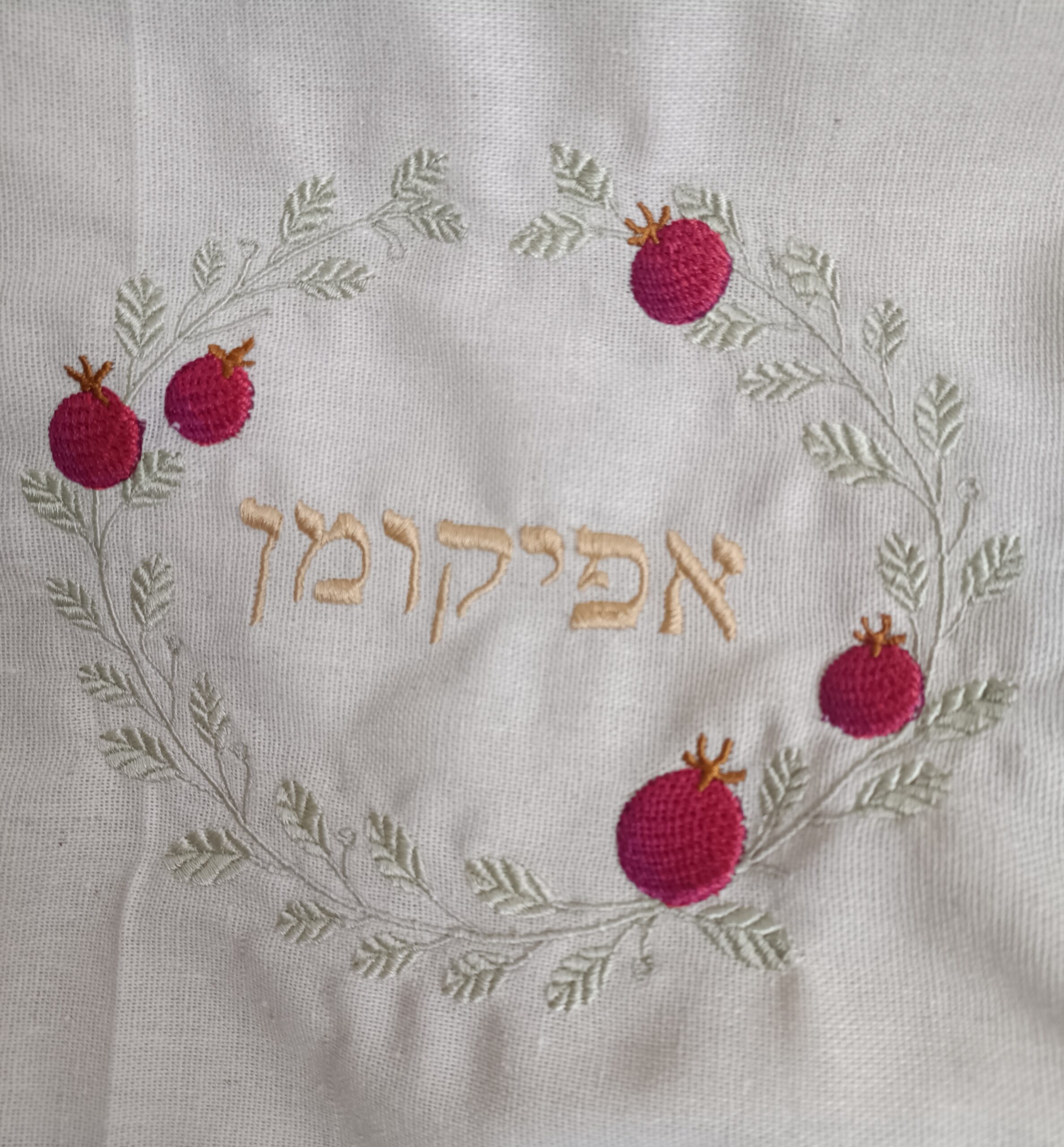 O bordado apresenta a palavra “Afikoman” em hebraico, cercada por uma guirlanda de romãs, símbolo tradicional de abundância e bênçãos na tradição judaica. O contraste das cores cria um bordado elegante e festivo, perfeito para acompanhar esse momento tão especial do Seder.