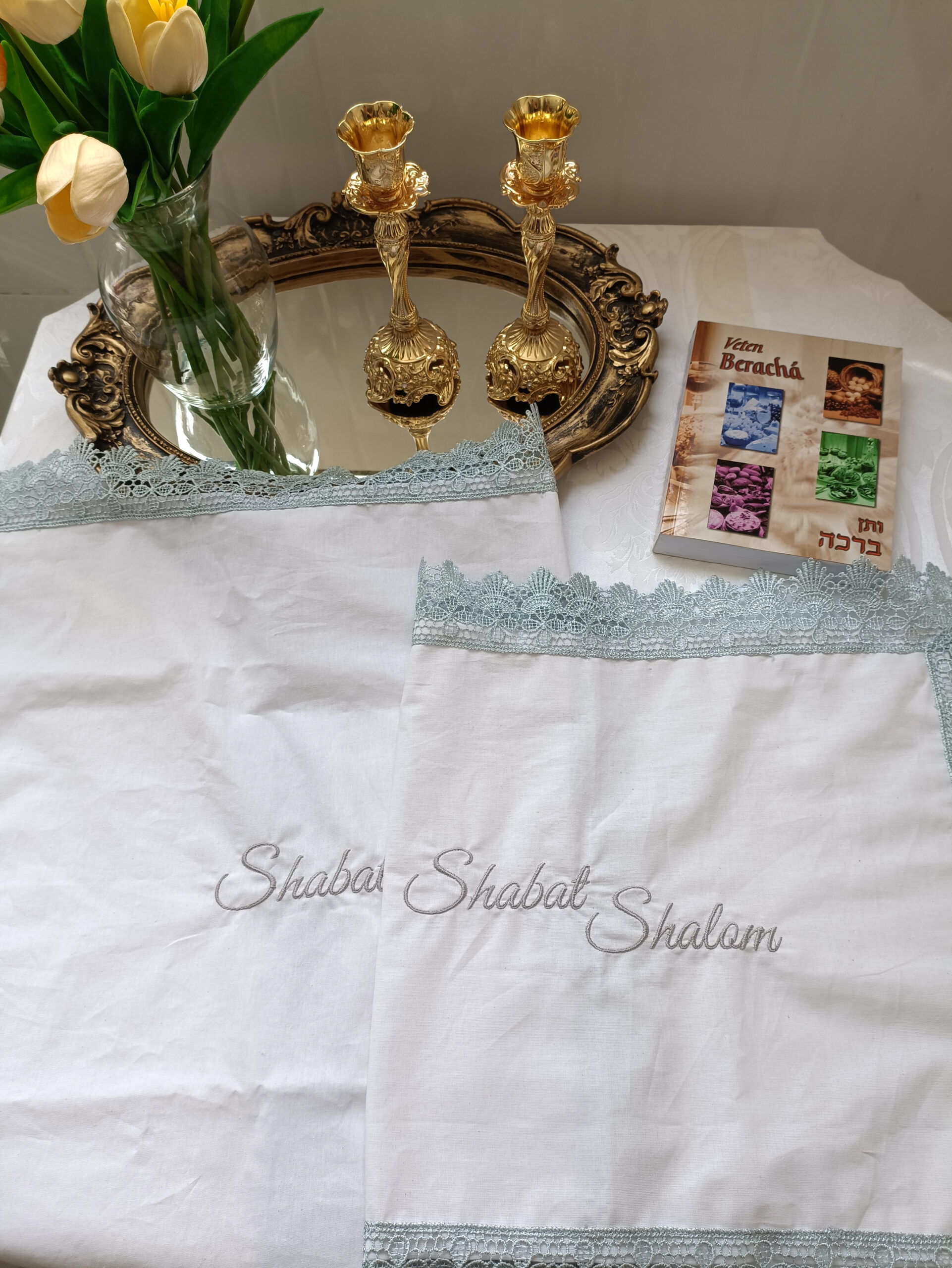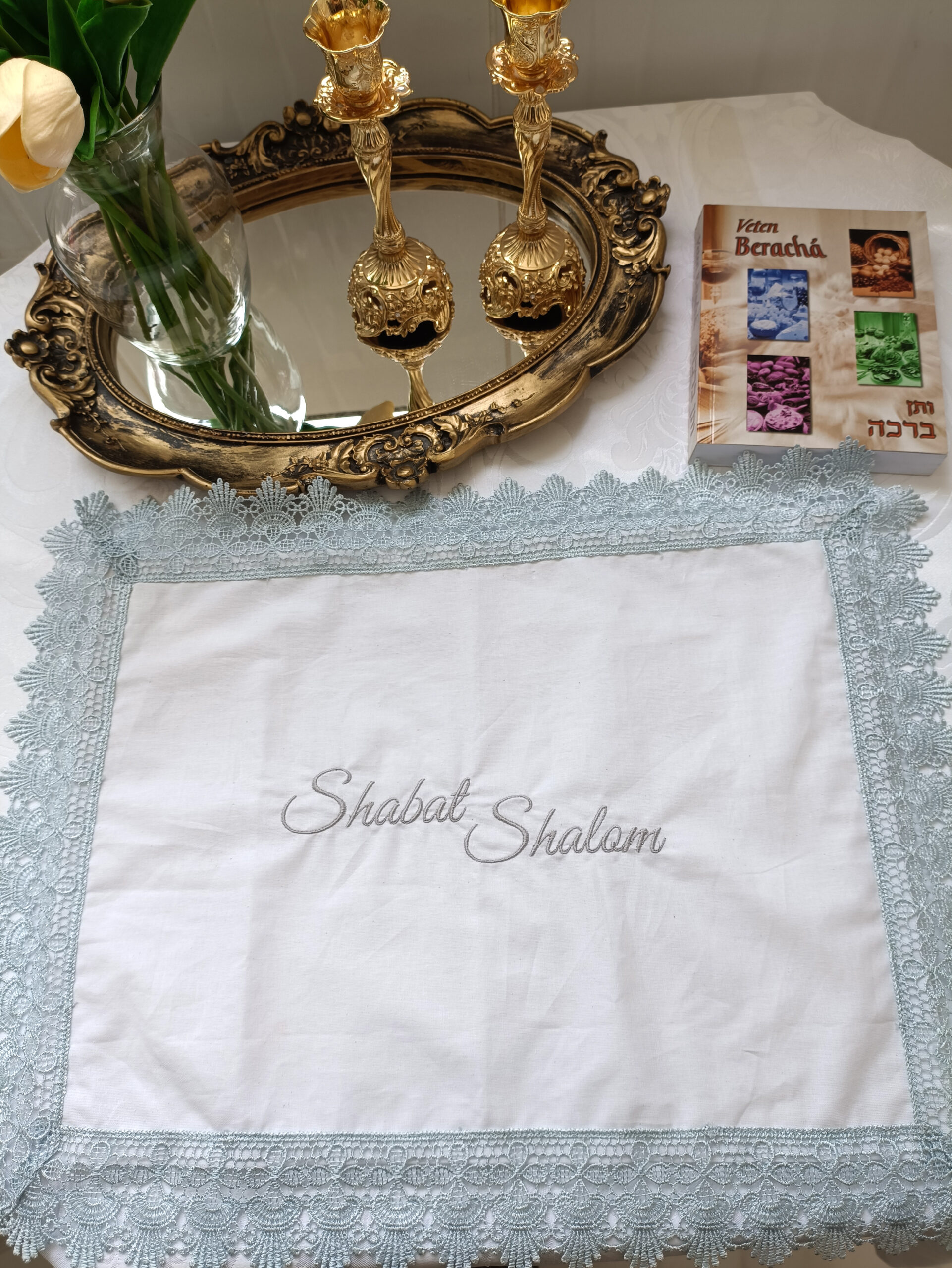 O bordado delicado com a inscrição Shabat Shalom transmite paz e acolhimento, enquanto o acabamento em gripir prata emoldura a peça com leveza e refinamento, valorizando cada momento das bênçãos.