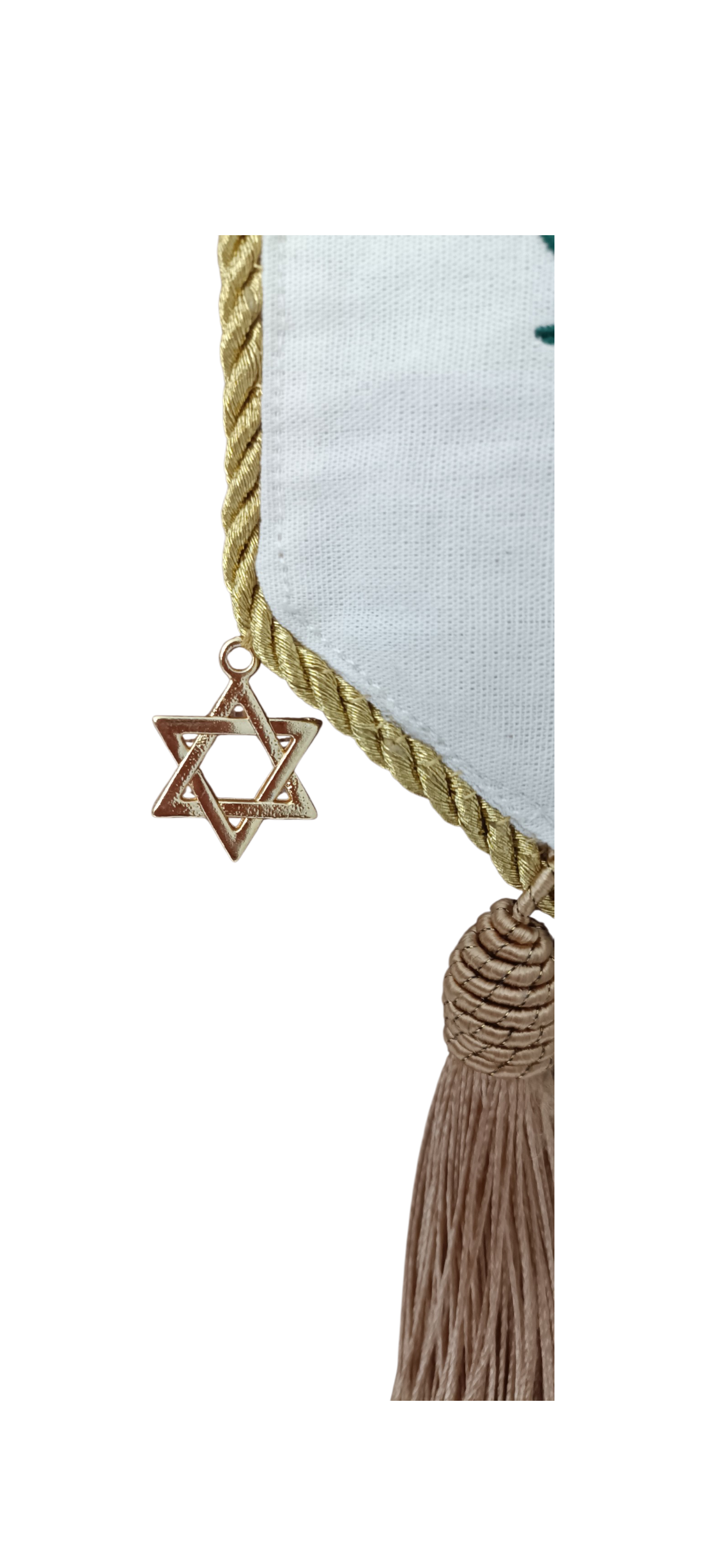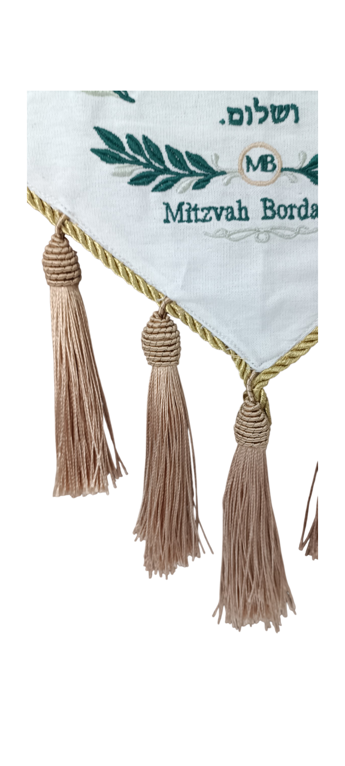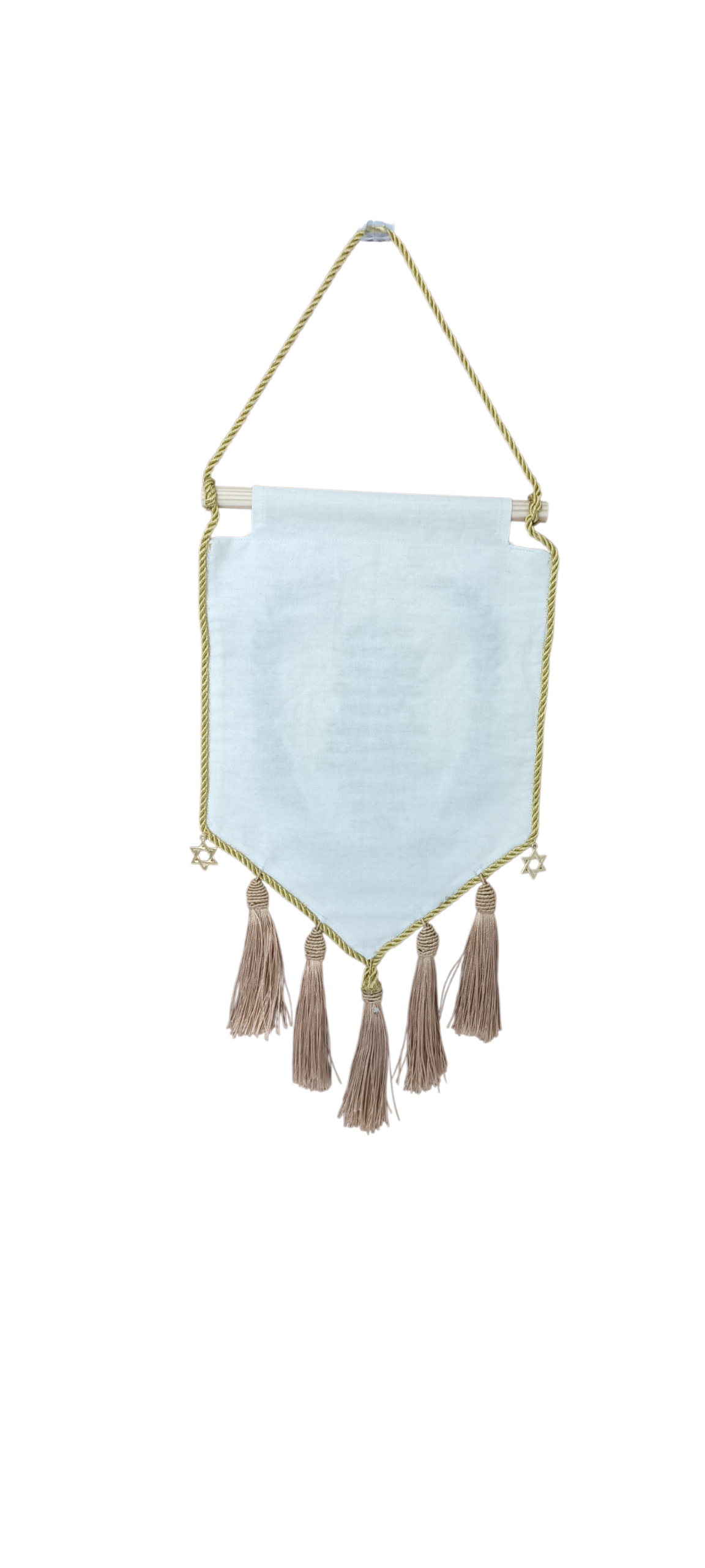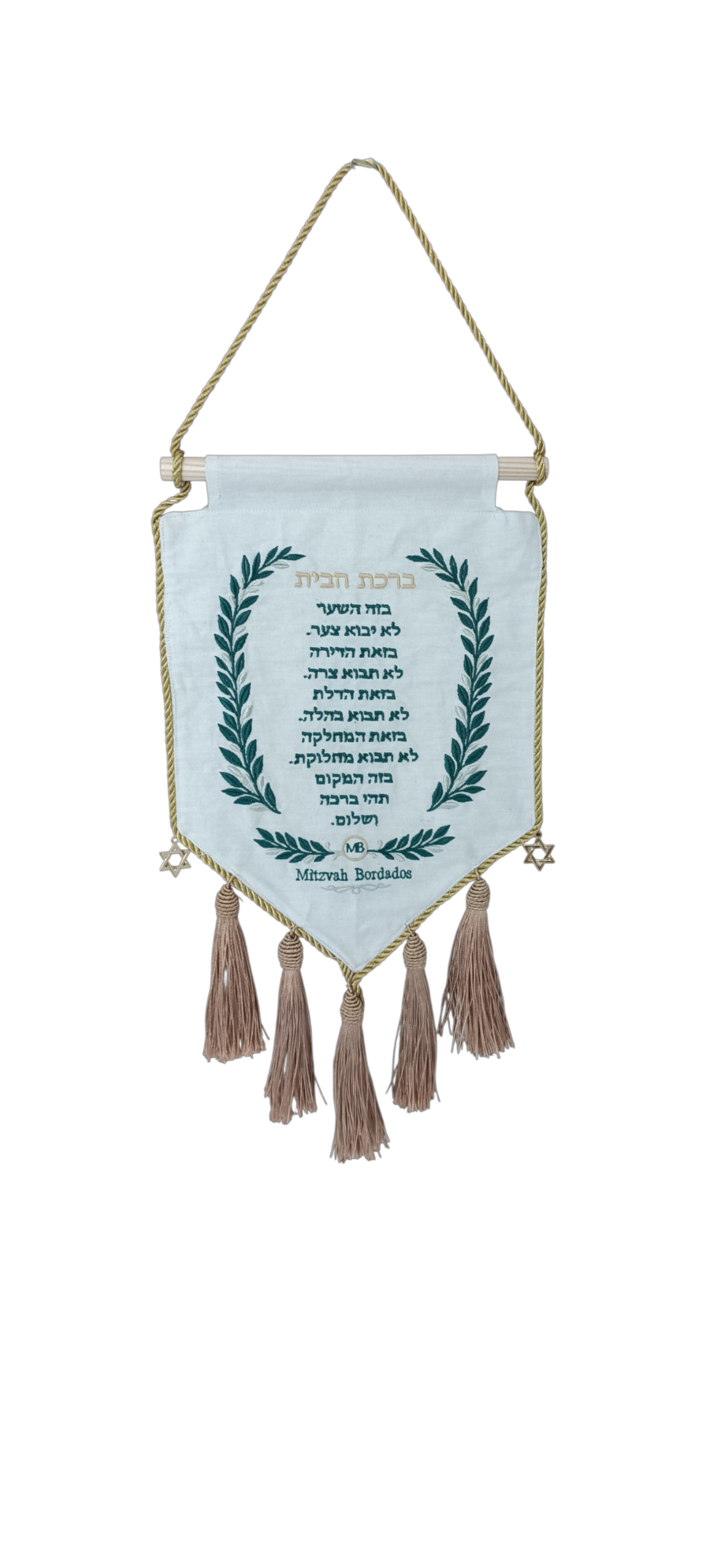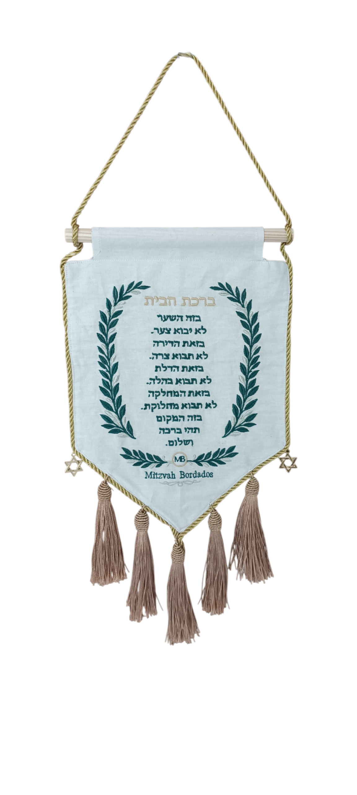 Decore seu lar com tradição e espiritualidade com esta flâmula bordada com a Bênção do Lar em hebraico, que traz proteção e harmonia para todos que vivem na casa.